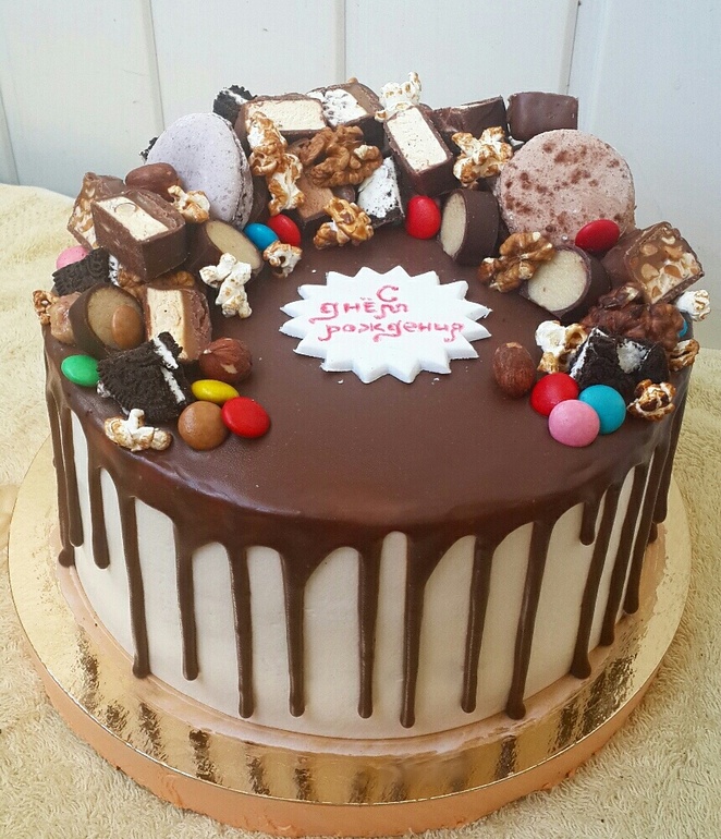 Торт на день рождения можно оформить мастикой, фруктами, шоколадными фигурками, цукатами, орешками и т.д.