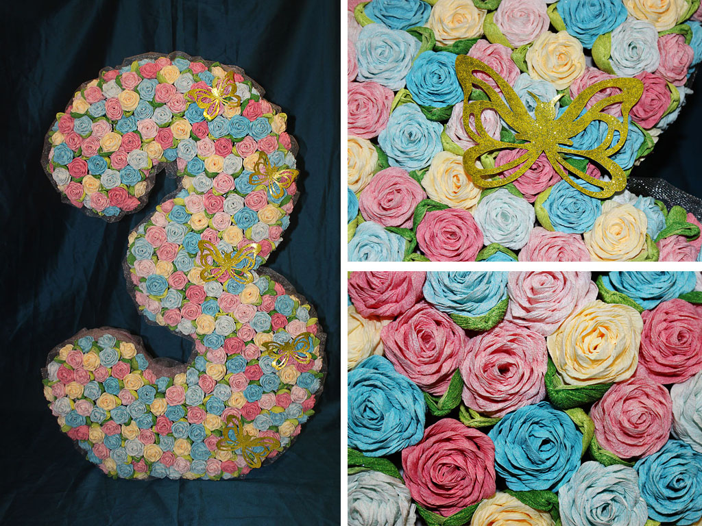 Оригинальная композиция из салфеток в виде цифры требует творческого подхода. Хотя их изготовление занимает не один час, эмоции счастливого именинника, получившего такую цифру, окупают все затраты времени и сил.