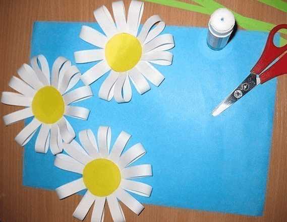 Вырезаем 4 ромашки и закрашиваем у них сердцевинку. Также заранее подготавливаем три полоски зеленой бумаги, шириной 0,5 сантиметра.