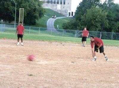 Первый номер второй команды уже наготове. Он подбегает к месту падения городка, ставит его стоймя, а затем точно так же угоняет городок обратно, стараясь выбить его за среднюю черту.