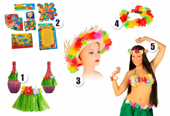 Для призов в различных играх и конкурсах вы можете взять сугубо гавайские атрибуты – заколки для волос, яркие футболки, фрукты, бокалы для коктейлей, эксклюзивные коктейли от хозяйки вечера или сладости.