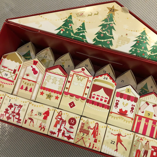 24 окошка (здесь отсчет начинается 8 декабря и заканчивается 31-ого), а внутри миниатюрные конфеты из светлого и молочного шоколада, причем ни один вкус не повторяется!