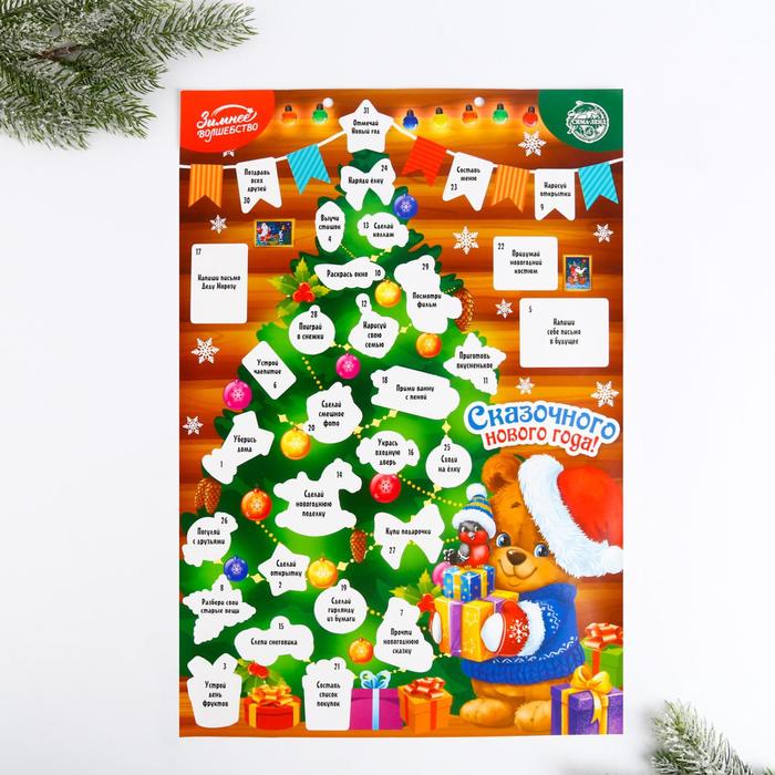Незатейливый, яркий и очень добрый адвент-календарь, который поможет сделать ожидание Нового года веселым и запоминающимся. На красочной коробке из плотного картона помещено 31 окошко. Ежедневно, начиная с 1 декабря, малыш открывает одну створку и дарит гостинец-наклейку зверьку, который живет в окошке. В наборе большой плакат, лист со множеством наклеек и веселые предновогодние задания на каждый день.