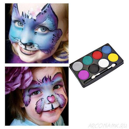 Вся краска для лица легко удаляется водой с мылом или детской салфеткой.