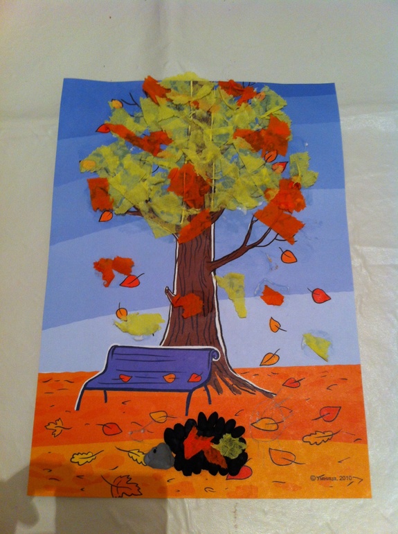 Воспитатель: Каждый может приклеить столько листочков сколько захочет. Листья можно приклеить и на землю около дерева для того, чтобы было понятно, что на нашей картине листопад.
