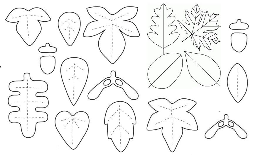 3. Для вырезания листьев нам понадобится толстый фетр оранжевого и зеленого цветов. На оранжевый фетр перерисуем контуры кленового листочка, а на зеленый фетр перерисуем контуры липового листочка. Еще один липовый листочек нарисуем на светло-желтом жестоком тонком фетре. Вырежем все три листочка острыми ножницами.