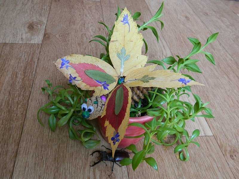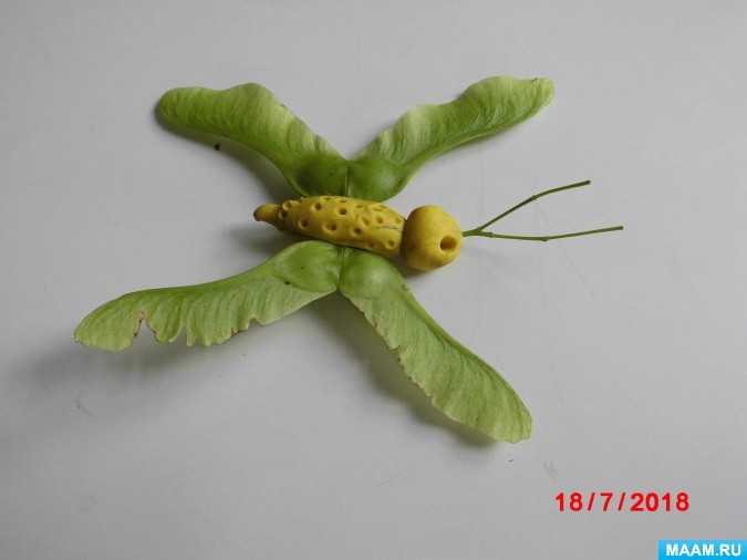 Тут я ещё хотела бы ещё сказать несколько слов о поделках их природных материалов. То есть, я понимаю, что крылья бабочек и стрекоз ПРИНЯТО делать из листьев или из вертушек клёна. Моё мнение — если бы ребенок САМ придумал такой изобразительный ход, это было бы великолепно. Но в действительности этого не происходит. Детям говорят собирать всякие шишки-семена, и потом под руководством взрослых они делают программные поделки — стрекоза там из клёна или ёж из шишки. Какое же это творчество? — Это ограничение возможностей детей. Им навязывают готовый рецепт, и они это и делают.