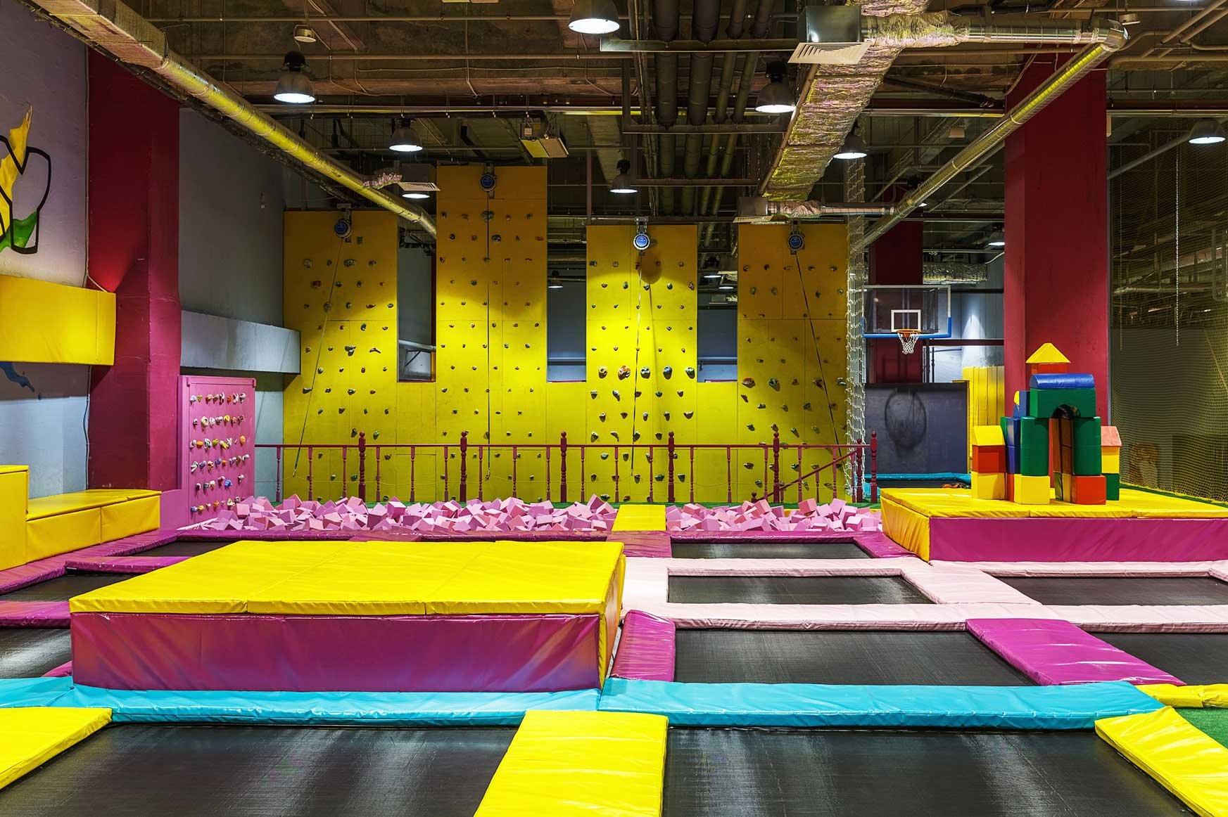 Внушительная площадь в 3000 кв. метров включает большую «прыгательную» зону с 70 батутами и двумя поролоновыми ямами, а также веревочный городок, троллейные трассы, горки, столы для аэрохоккея.