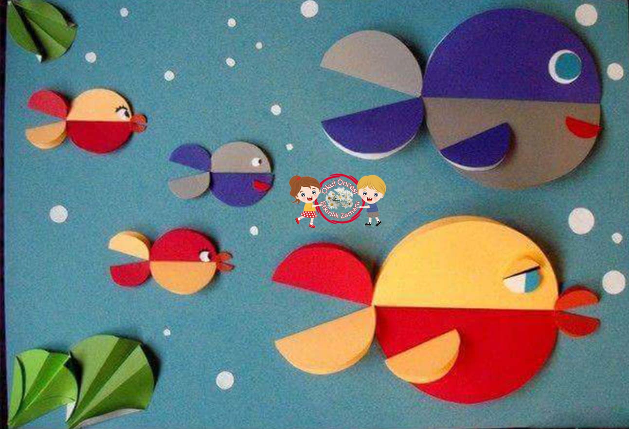 Для этого нужно вырезать из цветной бумаги шаблон-контур, например силуэт рыбки и несколько маленьких кругов. Предложите ребенку наклеить их в произвольном порядке.