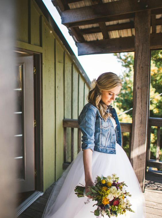 Создать неформальный образ поможет пиджак. Это может быть как элегантный костюмный элемент – одетый поверх нежного белого платья, он подчеркнет элегантность невесты, так и озорная джинсовая куртка, прекрасно вписывающаяся в стиль гранж.