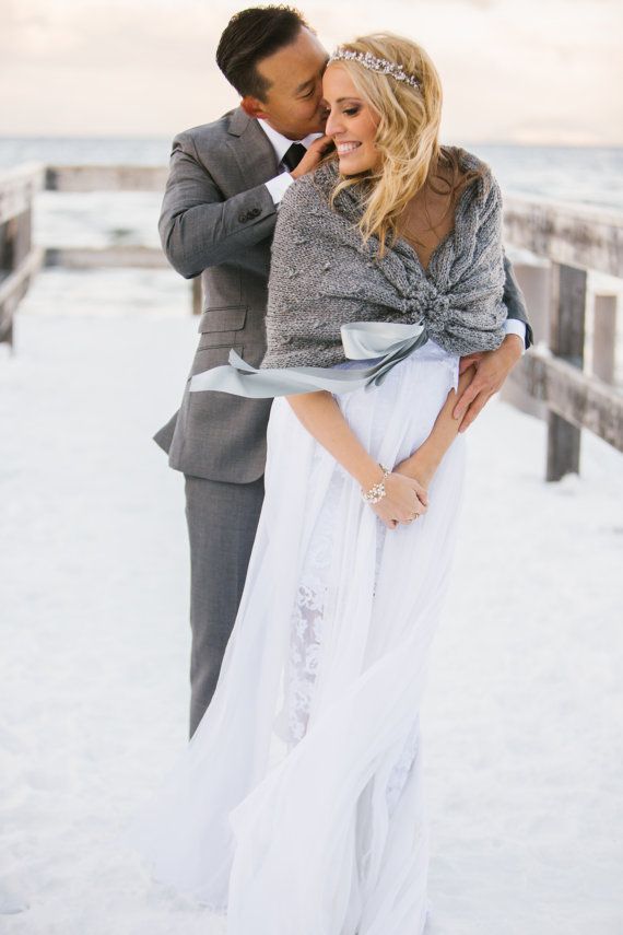 Небрежно наброшенный на плечи невесты палантин – просто дизайнерская находка для осеннего наряда. Это может быть готовая теплая накидка или вязаная шаль.