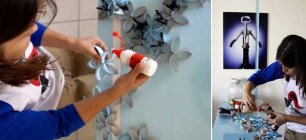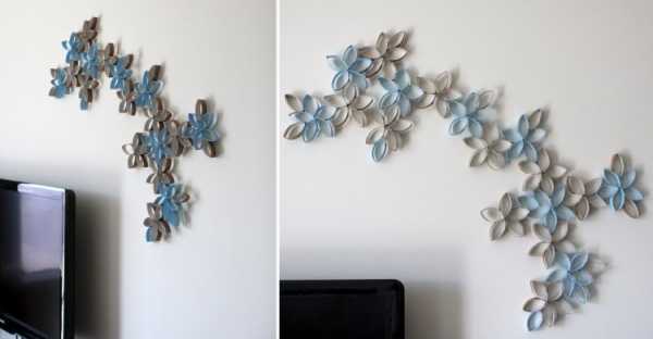 При использовании втулок от туалетной бумаги можно сделать воздушную композицию. Для этого картон нарезаем на кольца, складываем, а после склеиваем стандартным клеем ПВА. Для фиксации при просыхании скрепите все прищепками. Отдельные колечки или готовые цветы окрасьте. Их будет просто повесить на стену – всего лишь вбейте пару гвоздиков.