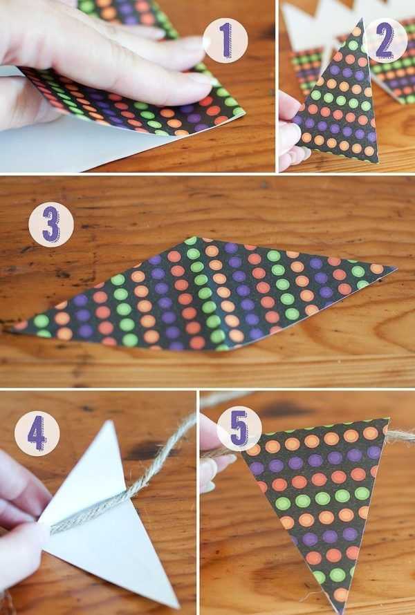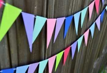 Гирлянда из бумажных флажков тоже должна создаваться с использованием шаблона. По нему будет производиться выкройка изделия. Также потребуется подготовить основание, на котором будут фиксироваться флажки.