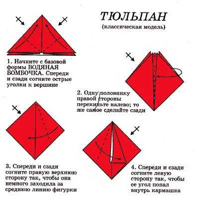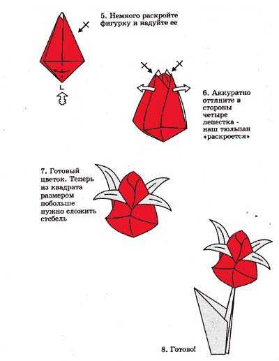 Для акции, например, к Восьмому марта или к 9 Мая, можно сделать несколько тюльпанов оригами по схеме, представленной на фото.