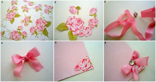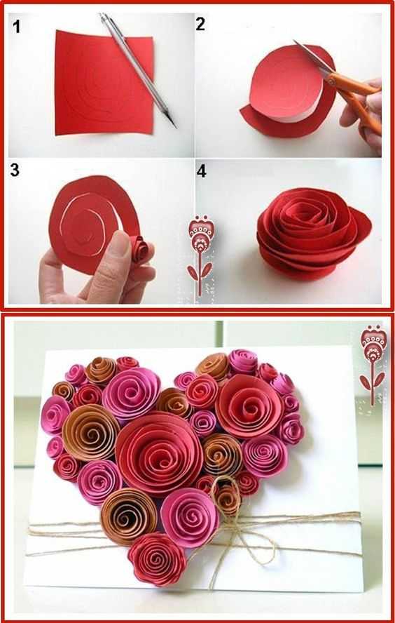 Легкие идеи для скрапбукинга – попробуйте вырезать розочки, листочки и лепестки из специальных листов бумаги. А затем приклейте все на открытку вместе с бантиками и декоративными украшениями.