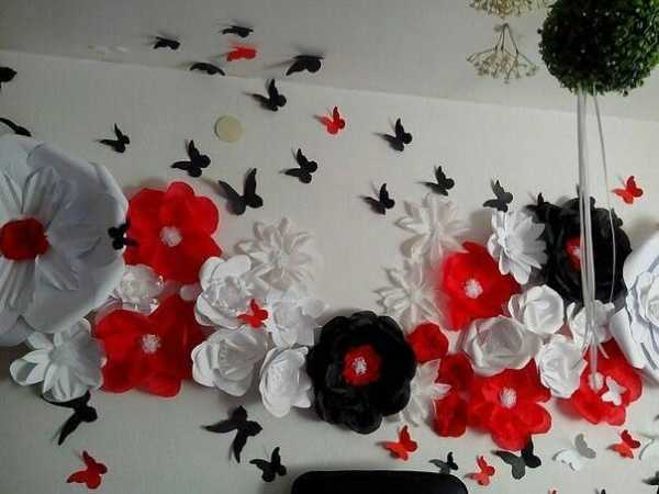 Стены украсьте плоскими или объемными цветами любой формы и размера. Если вам нравится занятие, можно создать целую композицию из цветов разных размеров, лент, листьев и даже драпировки. Конечно, в идеале все должно быть выдержано в едином стиле. Бутоны из бумаги могут напоминать розы, пионы, ромашки, маки или другие цветы невероятных форм. Иногда делают следующее – крупные цветы размещают как островок, а после мелкие цветочки. Еще вы можете вырезать много бабочек и повесить их на штору.