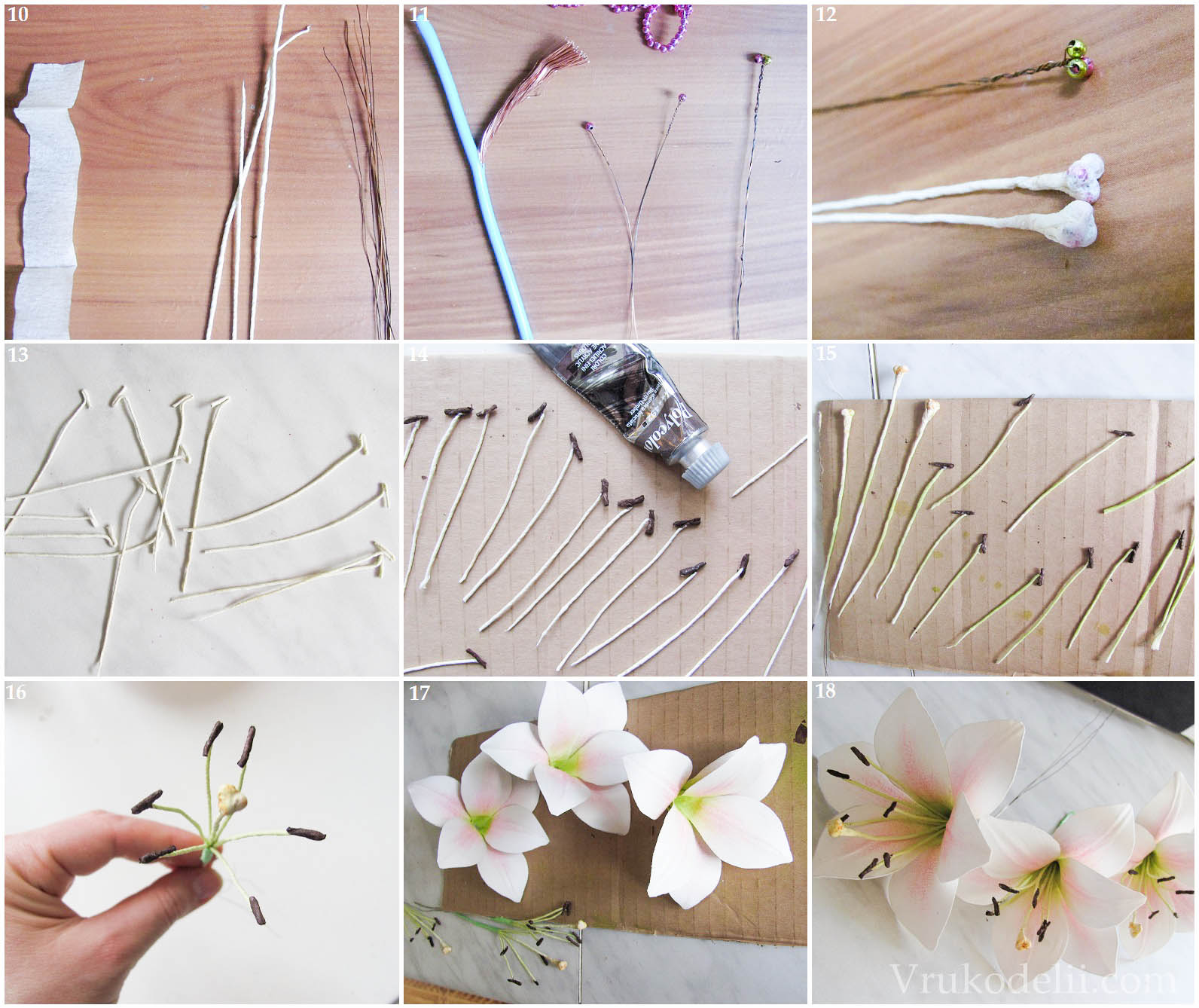 На проволоку друт или палочку закрепляем тычинки. Приклеиваем лепестки.