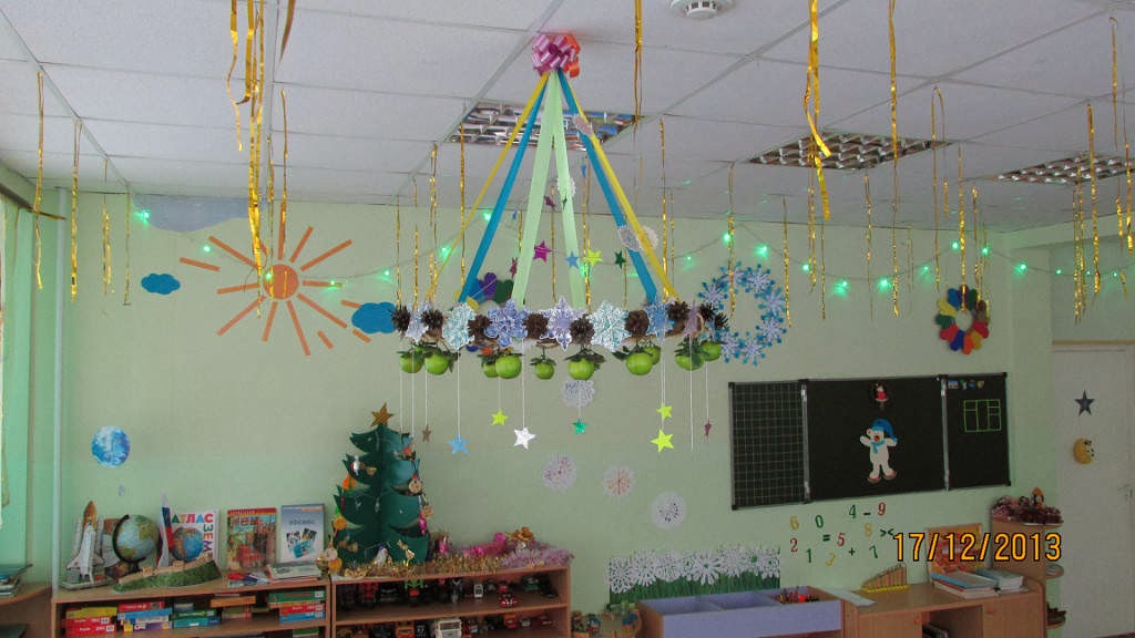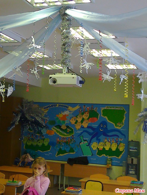 Сам же потолок на Новый год украшают снежинками или дождиков. На таком предмете, как технология педагог класса может с учениками вырезать и склеить огромное количество снежинок, которые крепятся к потолку посредством ниточки или английской булавки.