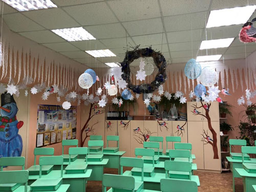 Если праздника ждать еще долго, можно на время отложить украшение школьного холла и заняться классами. Очень важно привлечь к этому процессу учеников. Попросите их создать новогодние украшения своими руками — так дети смогут в полной мере проявить фантазию, почувствовать определенную степень ответственности за то, как будут выглядеть их классные кабинеты в канун Нового Года.
