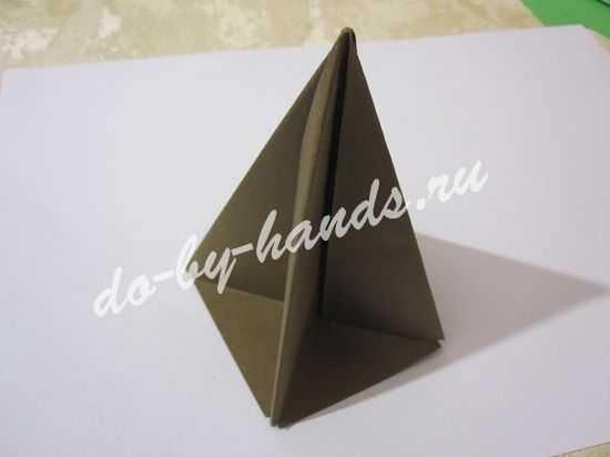 Для ствола возьмем коричневую бумагу и таким же образом как и зеленый, согнув по диагонали, прячем углы внутрь.