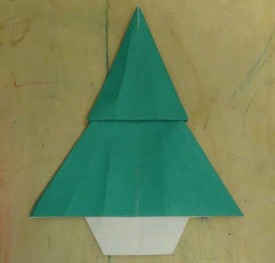 Дети 6 лет могут остановиться на третьем шаге. У них получится вот такая простая елочка оригами.