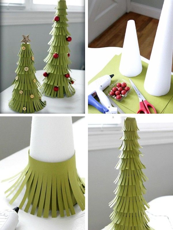 Совсем не сложная поделка новогодней елочки. Принцип такой: нарежьте много шаблонов, чтобы приклеить их на бумажный конус. У вас получится пушистая елочка.
