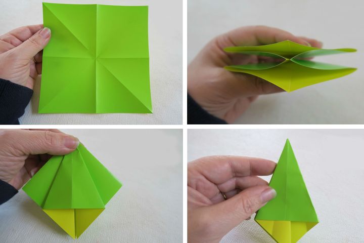 - Раскройте последовательно каждый треугольник и продавите сгибы внутрь к центральной оси, формируя елочку.