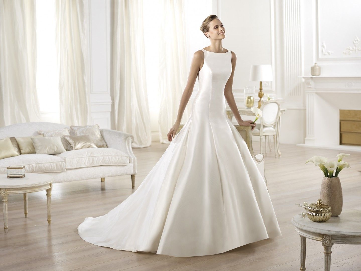 Платье прямого фасона обычно шьется одним кроем и может быть дополнено поясом или шлейфом. Недостатком платья такого покроя является облегающий силуэт, который подчеркнет область живота и бедер у девушек с телосложением “груша” и “яблоко”. Обладательницам пышных форм также стоит отказаться от свадебного платья прямого покроя.