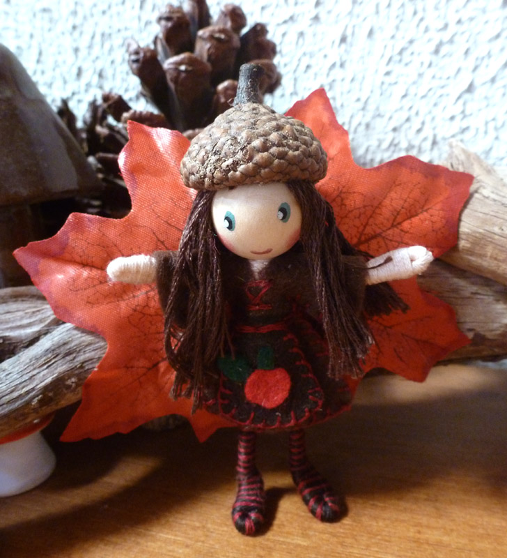 - Волосы и беретик: несколько нитей пряжи приклейте к голове феи, нанесите немного клея на внутреннюю поверхность шляпки желудя и приклейте к прическе.