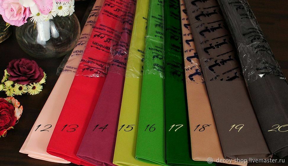 - Подарочная и цветная бумага. Бывает листовой, однотонной, гофрированной, сжатой, вафельной либо дополненной различными тематическими изображениями. Широким спросом пользуется корейская бумага, которую просто деформировать, придавая букету красивый вид.