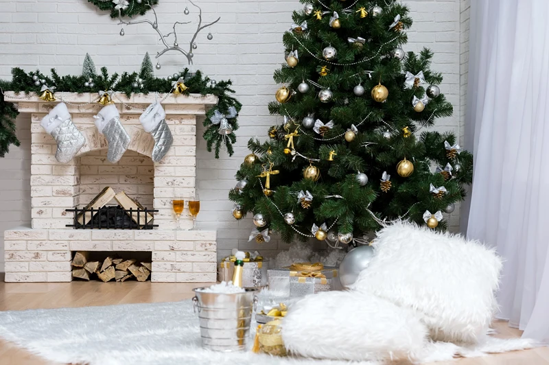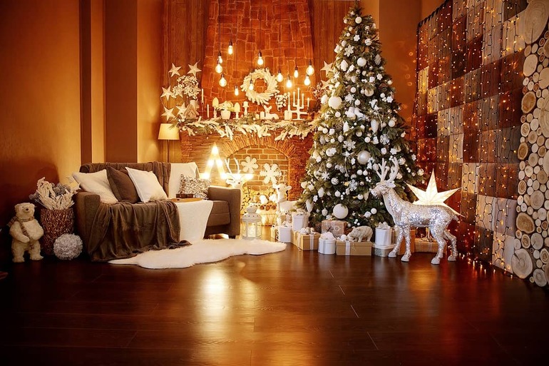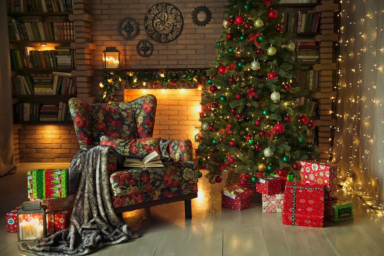 — Фотофоны тематические. Подойдут для съёмки детей, семейных групповых портретов. Например, детский фотофон с гирляндами и новогодним декором в виде лося, светящихся ёлок, пряничного человечка, а также фон с ёлкой и игрушками. Фэнтезийный вариант — фон с Сантой, летящим по небу на оленьей упряжке. Для самых маленьких подойдет рисованный под мультик фон со снеговиками. Семейный фотофон с ёлкой и уютным камином или аналог с ёлкой и подарками. Более нейтральный и минималистичный вариант, который подойдет также для новогодних корпоративов — фон под дерево, празднично украшенный еловыми лапами, шишками и колокольчиками.