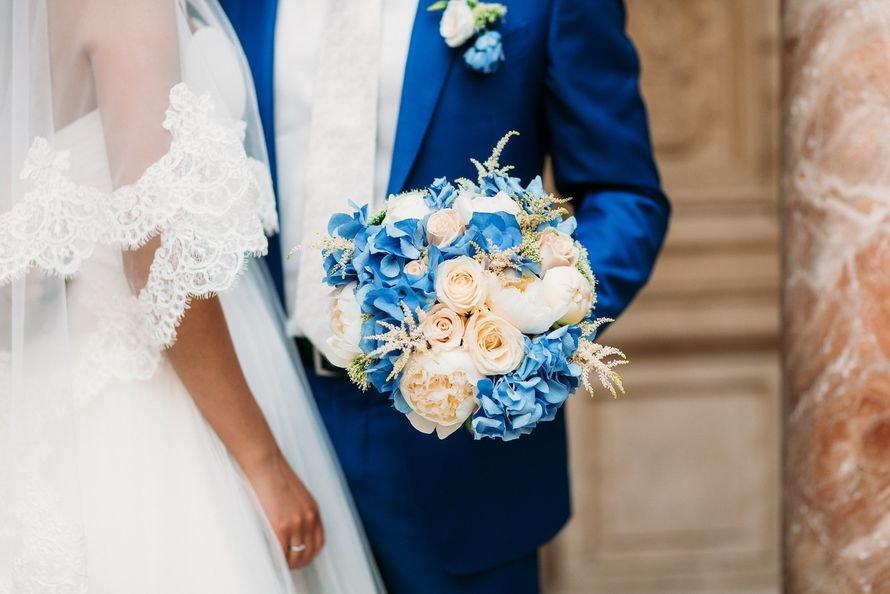 Поэтому букет должен быть идеальным, отображать стилистику торжества. Найти цветы нужного оттенка в природе сложно, но флористы научились их безопасно выкрашивать. Симпатично смотрятся фиалки и гортензии. Богато – орхидеи и ирисы. Оригинально – тюльпаны и лилии. Можно выбрать живую композицию из других оттенков, контрастных синему. Например, отлично будут смотреться на фоне белоснежного платья желтые тюльпаны или розы, собранные и перевязанные синей лентой. Большие желтые подсолнухи станут отличным вариантом для свадьбы в стиле рустик. Мини-копии букета невесты могут быть и у подружек. Стильно будут смотреться аккуратные композиции из орхидей или роз.