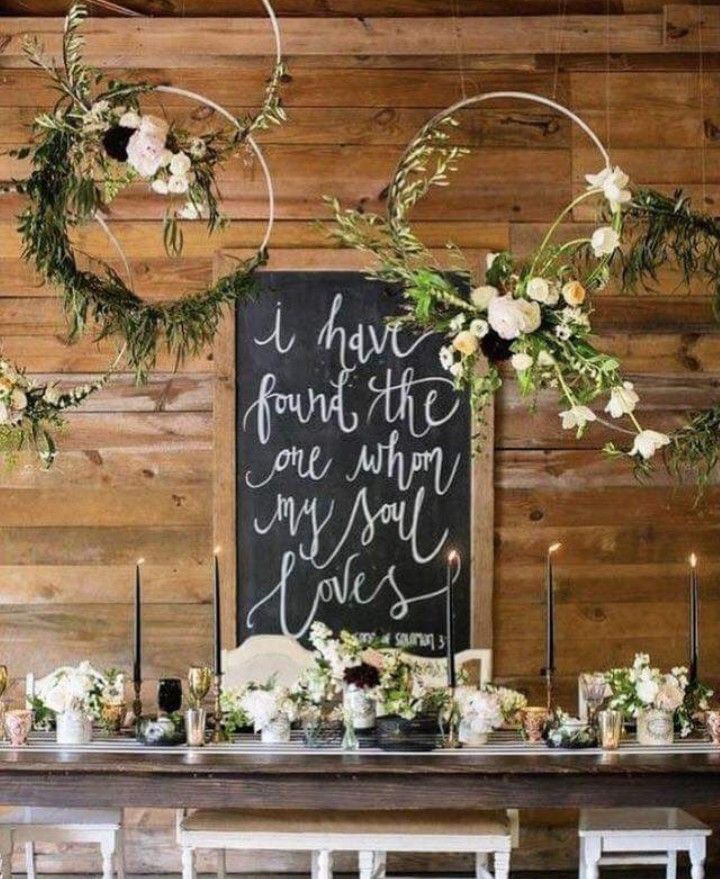В верхней части обычно пишут имена молодоженов, а по бокам – любые слова и фразы, относящиеся к свадьбе. Обычно ставят дату свадьбы, слова «Муж» и «Жена», а остальной текст дописывают в меру желания и фантазии – это может быть что угодно, включая поговорки и крылатые фразы о любви и браке. Центральная часть обычно остается свободной – там позируют молодожены, а также их приглашенные. Фотозона «Меловая доска» чаще всего устанавливается не внутри помещения, а снаружи. На фоне природы она особенно эффектно.