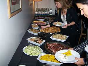 Фуршет — У этого термина существуют и другие значения, см. Фуршет (значения). Стол, накрытый для фуршета Фуршет (фр. fourchette вилка) … Википедия