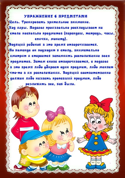 По команде водящего «Раз, два, три – смотри!» игрок открывает глаза и поворачивается лицом к столу. Он должен правильно ответить на вопросы водящего: «Какие игрушки исчезли? Больше стало игрушек или меньше? На сколько?» и т.п. Побеждает игрок, который во время игры был более внимательным.