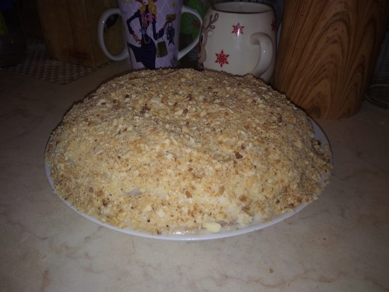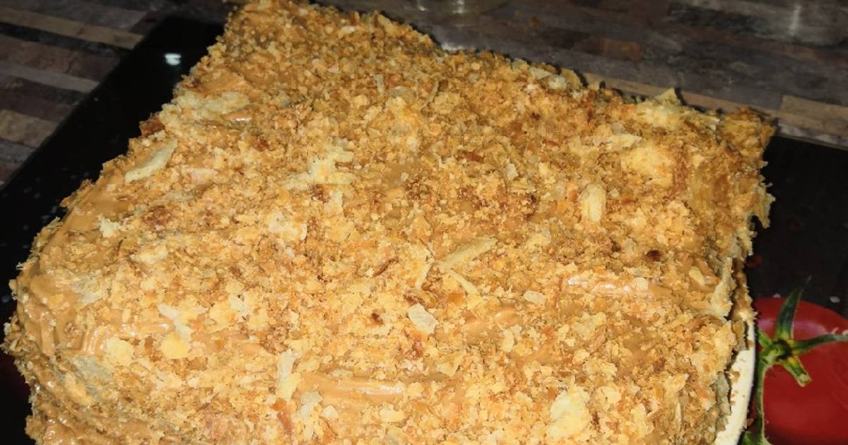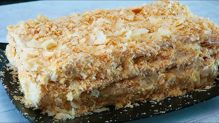 - Готовый наполеон из покупного слоеного теста обсыпают крошками. Для их приготовления используют обрезки, оставшиеся после оформления коржей.