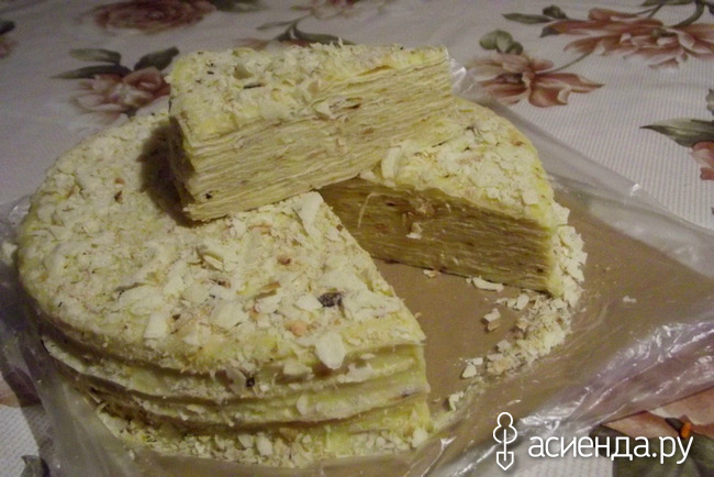 - Оформляют наполеон из слоеного дрожжевого теста, промазав коржи кремом, и оставляют для пропитки.