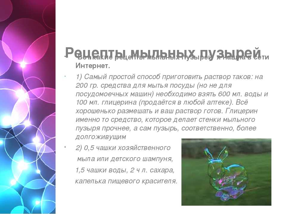 В этом материале мы рассмотрели, как сделать мыльные пузыри дома самостоятельно, какие средства подойдут для этого.