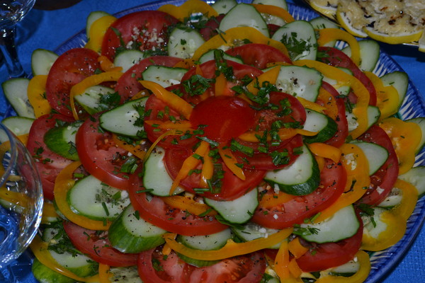Если простой салат из огурцов и помидоров кажется вам чересчур банальным кушаньем для праздничного стола, добавьте в него дополнительные компоненты. Они сделают салат более нарядным и вкусным, а следовательно — более праздничным. Можно ввести в список ингредиентов салатные листья, маслины, оливки, креветки, сыр, сладкий перец, отварную брокколи, сельдерей, зеленый горошек, лук, редис, авокадо и др. Всё по вашему вкусу. Какие ингредиенты нравятся — такие и вводятся. Если взять сладкий перец разных цветов — салат получится очень ярким и эффектным.