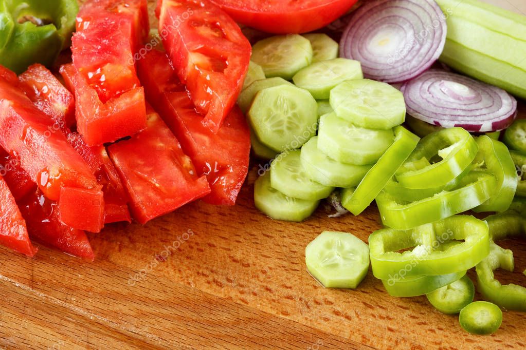 - Огурцы и помидоры можно нарезать как угодно. Я предпочитаю тонкие ломтики, так как люблю добавлять их в бутерброды.