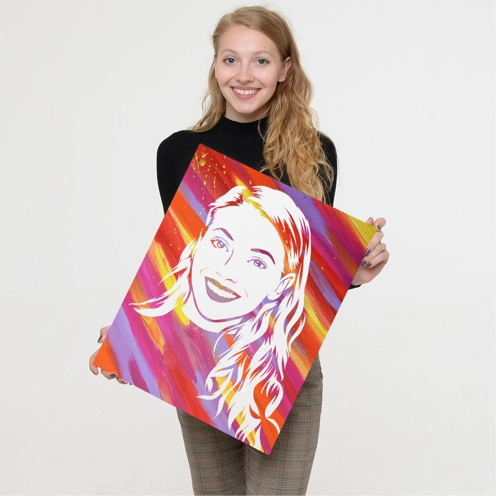 То, что приглашенные и виновник торжества увидит на холсте, приятно потрясет изображение. Это будет портрет на ярком фоне. Самая главная фишка заключается в том, что всю эту красоту гости создали сами, и трудились они для своего близкого человека.