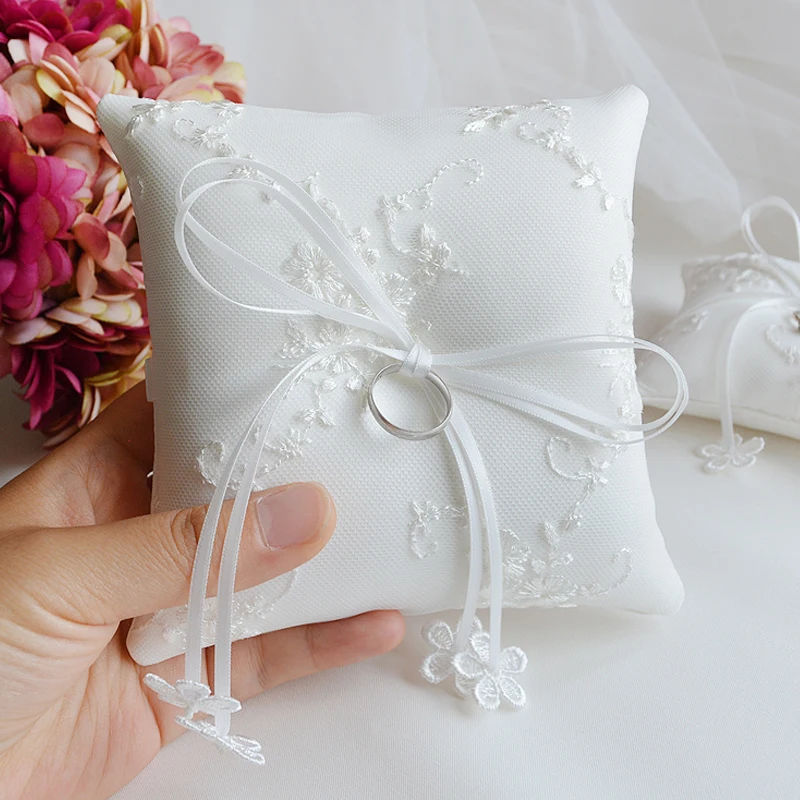 Украшать ее лучше всего не очень обильно, потому что такая свадебная подушка сама по себе будет интересно выглядеть. Пришейте бант из атласной ленты, на котором будут держаться кольца, а в середину добавьте бусину. Такого минималистичного дизайна будет вполне достаточно.