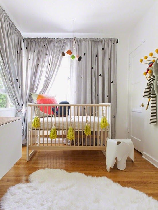 Шторы. Выбирая шторы и текстильное наполнение, позаботьтесь о том, чтобы они были изготовлены из таких тканей, которые удобно часто стирать или чистить. Хорошо подходят для комнаты малыша римские шторы или легкие занавески , которые не препятствуют проникновению солнечных лучей. Если вы выбрали плотные шторы, то установите удобный карниз, чтобы при необходимости шторы легко было распахнуть.