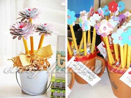 Почти не займет времени создание необычного букета из ромашек с вклеенными туда снимками учеников и преподавателя. Еще один недорогой вариант — букет или корзинка из конфет, карандашей и других канцелярских принадлежностей.