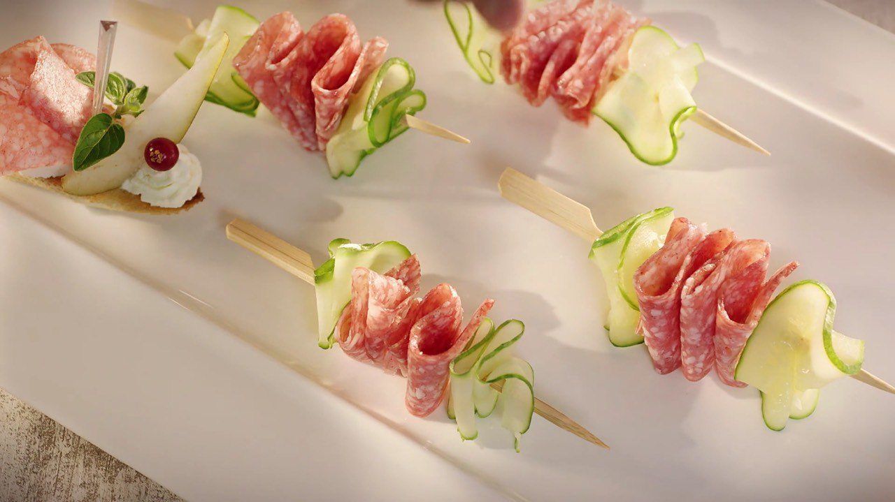 Для этого возьмите шпажку (лучше бамбуковую или деревянную, пластмассовые «простят» блюдо и дешево выглядят) и на нее насадите маслину (используйте маслины без косточек). Теперь насадите огурец волнообразно. Кусочек колбасы сложите пополам, потом еще раз пополам и также насадите на шпажку. Проделайте эту процедуру со всеми шпажками и продуктами, которые необходимо насадить.