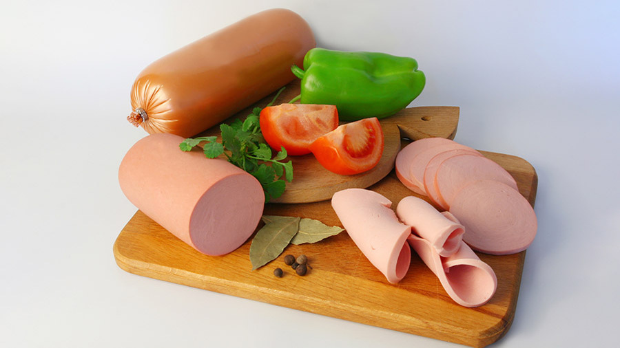 Сырые колбаски на стеллажах в кладовке на мясокомбинате