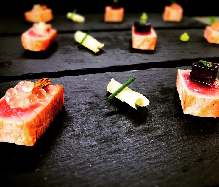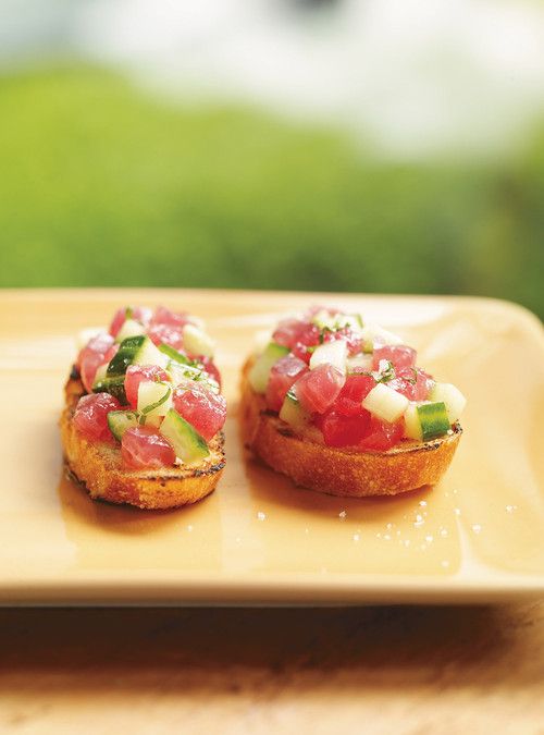 Красивый тунец сбрызгивается кунжутным маслом, обмакивается в семена кунжута и обжаривается на очень горячей сковороде, чтобы семена кунжута образовали аппетитную корочку. Подаются с соевым соусом, из них получается идеальное быстрое канапе.