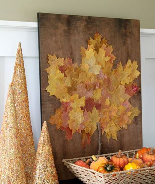 - Картины из кленовых листьев. Именно кленовые листья в осенний период приобретают самые яркие и замысловатые оттенки. Создать картину из кленовых листьев можно за вечер. Для этого приготовьте лист фанеры или очень плотного картона.