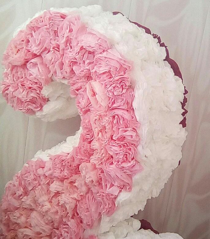 Количество цветочков зависит от размера цифры. Если цифра примерно 1 метр, то цветочков нужно сделать 300-350 штук. Чтобы изготовить цветочек сворачиваем салфетку пополам и так несколько раз. Степлером посередине соединяем салфетки. При помощи шаблонной линейки рисуем круг диаметром 5 см. Затем вырезаем ножницами. Каждый слой салфетки отделяем, прижимая собираем к центру. Получается пушистая розочка. Изготавливаем нужное количество и приклеиваем плотно друг к другу на цифру. Эффектно смотрится цифра, если розочки двух цветов. Это уже зависит от вашей фантазии. Если вы сделали маленькие цифры, то вам понадобится подставка. Для этого делаем круг из пенопласта диаметром 5см , вставляем в него палочку, места соединения фиксируем клеем. Другой конец палочки вставляем в цифру. Основание подставки точно также декорируем розочками, а палочку обмотать атласной лентой. Такие цифры украсят ваш праздник, создадут уют и хорошее настроение.