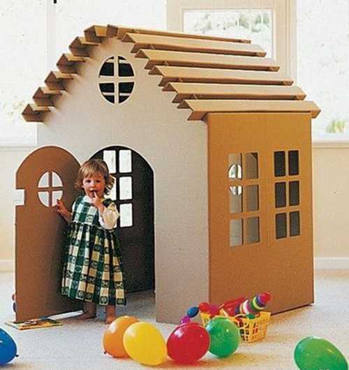 Хотите порадовать своего ребенка? Сделайте для детей домик из картона своими руками. Для малышей лучшее развлечение – это спрятаться в укрытии. Картонный домик станет постоянным местом игр у ребенка. Как сделать такой подарок своему чаду? Изготовьте выкройку. Нарисовать ее можно на обоях, которые остались после ремонта. Проектировать строение нужно с запасом, чтобы ваш ребенок мог наслаждаться своим укрытием не один сезон, а несколько лет. Две боковые стенки нужно объединить с фронтонами. Длинные стены – это прямоугольники. А крышу для устойчивости конструкции нужно делать из прямоугольников, свернутых буквой «П». Такие большие «скрепки» будут цепляться за выступы, которые необходимо создать во фронтоне. В длинных стенках домика прорежьте окна, а в одной из боковых частей нужно вырезать дверь. Прикрепить ее можно с помощью пружин или старого дверного механизма.